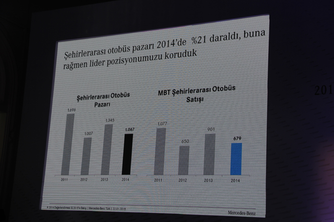 Mercedes Benz Türk Otobüs Pazarlama ve Satış Müdürü Burak Tarım : Şehirlerarası belli bir Pazar ortalaması tutturmuş durumdayız aynı zamanda 47 yıllık yerimiz belli piyasada.Önümüzdeki sene çok değişmeden payımızı arttıracağız.Şehiriçi pazarında yerel seçim öncesi otobüs yatırımları oldu ve tarihin en büyük pazarıyla karşılaştık.Bu sene için konuşursak oluşan pazarın büyük bir bölümü geçen sene yapılan ihalelerin teslimatının oluşurduğunu söyleyebiliriz.Çok rakipli bir pazar beklemiyoruz” dedi.
