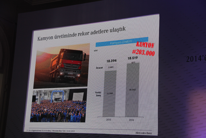 Mercedes-Benz Türk’ün kamyon ürün grubu ise, 2014 yılında da 18.353 adetlik rekor satış ile pazarın başrolündeydi. Bu rakam ile şirket, tarihinin en yüksek kamyon satış adedine ulaştı. Ürettiği kamyonların 500 adedini 2014 yılı içerisinde ihraç eden Mercedes-Benz Türk’ün kuruluşundan bu yana ihraç ettiği toplam kamyon sayısı da böylece 31.500 adede ulaştı. Şirket, 2015 yılında Aksaray Kamyon Fabrikası’ndan dünya pazarlarına ihraç edeceği araç sayısını arttırmaya yönelik çalışmalarını da sürdürüyor.