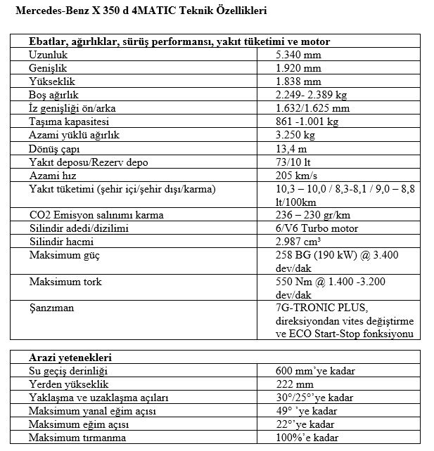 Aralık 2017’de Türkiye pazarında Premium Pick-Up olarak yerini alan Mercedes-Benz X-Class, yeni V6 motor seçeneği X 350 d 4MATIC’i Türkiye’de müşterilerin beğenisine sundu. 258 BG’lik motoruyla Pick-Up segmentinde “Güç Gösterisi”ne hazırlanan Mercedes-Benz X 350 d 4MATIC, üstün off-road yeteneği, yüksek taşıma kapasitesi ve çekiş kabiliyeti sayesinde ister şehir içi günlük kullanım, ister bol virajlı karayolları, ister asfalt dışı yollar, isterse de çamurlu ve zorlu arazi şartları gibi her türlü koşulda kullanıcısına oldukça başarılı bir sürüş konforu sunuyor.