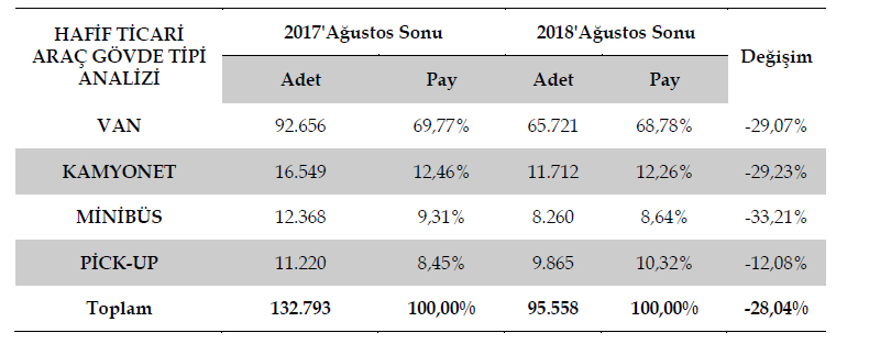 Kasa tiplerine göre değerlendirildiğinde ise en çok tercih edilen gövde tipi yine Sedan otomobiller (%51,0 pay, 175.721 adet) oldu. 2018 yılı Ağustos ayı sonunda Hafif Ticari Araç Pazarı gövde tipine göre değerlendirildiğinde, en yüksek satış adetine %68,78 pay ile Van (65.721 adet), ardından %12,26 pay ile Kamyonet (11.712 adet), %10,32 pay ile Pick-up (9.865 adet) ve %8,64 pay ile Minibüs (8.260 adet) yer aldı.