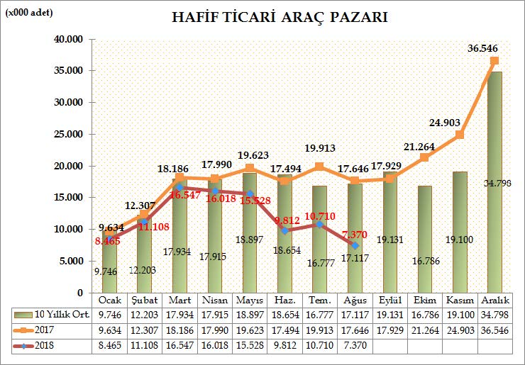 Otomobil Pazarı %18,5 , Hafif Ticari Araç Pazarı %28 Azaldı. Türkiye otomobil ve hafif ticari araç toplam pazarı, 2018 yılı sekiz aylık dönemde bir önceki yılın aynı dönemine göre %20,79 azalarak 440.428 adet olarak gerçekleşti. 2017 yılı sekiz aylık dönemde ise 555.991 adet toplam pazar gerçekleşmişti. Otomobil satışları, 2018 yılı Ağustos ayı sonunda geçen yılın aynı dönemine göre %18,51 oranında azalarak 344.870 adet oldu. Geçen yıl aynı dönemde 423.198 adet satış yaşanmıştı. Hafif ticari araç pazarı, 2018 yılı Ocak-Ağustos döneminde bir önceki yılın aynı dönemine göre %28,04 azalarak 95.558 adet oldu. 2017 yılı aynı dönemde 132.793 adet satış gerçekleşmişti.