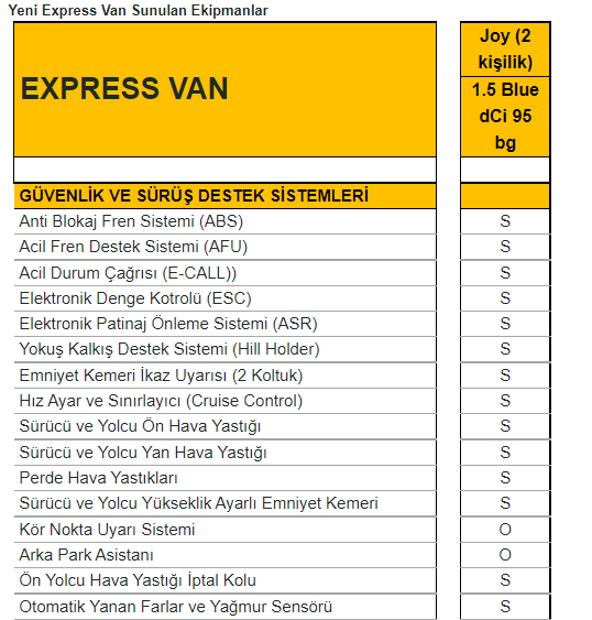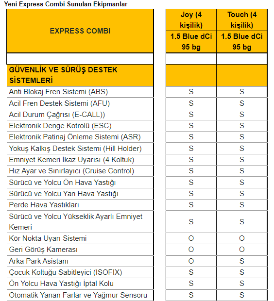 Yeni Express Combi ve Express Van’da ayrıca Yokuş Kalkış Destek Sistemi, Hız Ayar ve Sınırlayıcı, Kör Nokta Uyarı Sistemi, Arka Park Asistanı ve Combi versiyonlarda Geri Görüş Kamerası gibi özellikler de bulunuyor.