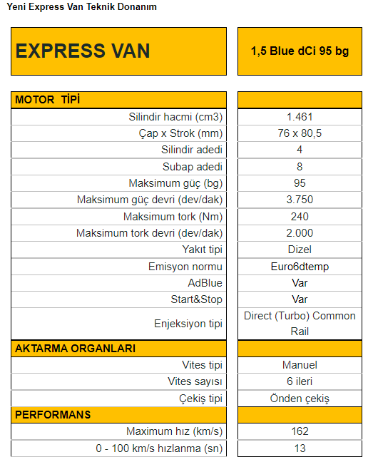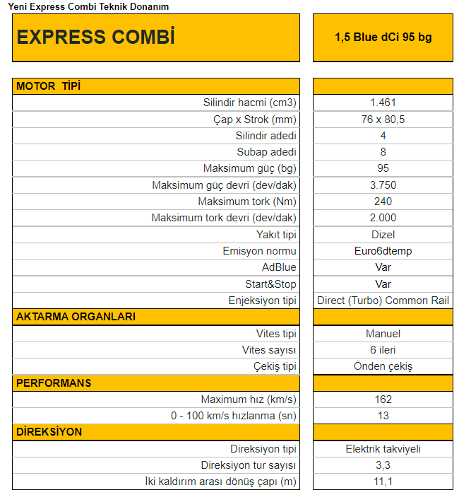 Yeni Express Combi ve Express Van, 1.5 dCi 95 bg dizel motorla satışa sunuluyor. Yeni Express, 95 bg dizel motorla 6 vitesli şanzıman sunarken, konsoldan etkinleştirilen Eco-Mode sistemi, ek yüzde 12 yakıt tasarrufu sağlıyor. “Vites Değiştirme Göstergesi”, vites değiştirmek için en iyi zamanın ne zaman olduğunu sürücüye bildiriyor ve böylece yakıtta ekstra yüzde 5 tasarruf sağlanabiliyor.