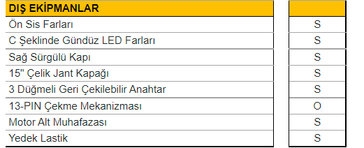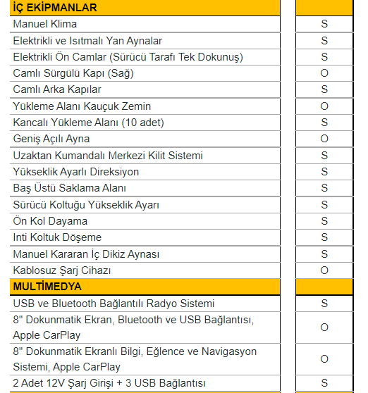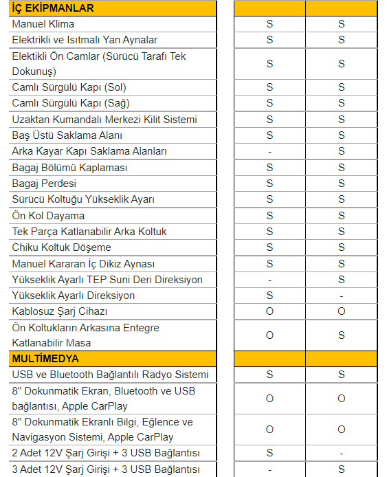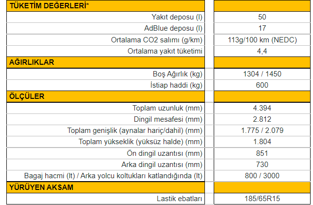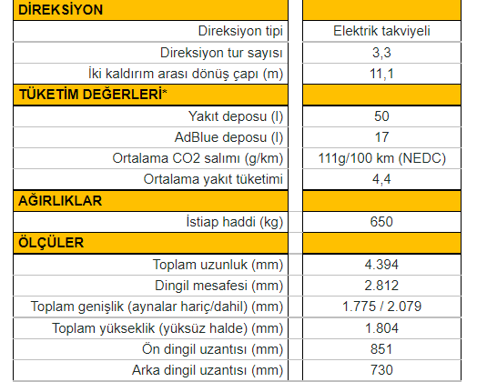 * Tabloda yer alan boş ağırlık ve istiap haddi değerleri ilave donanımsız standard araca ait veriler olup, bu veriler üretim toleransları ve araçtaki donanım seçeneklerine göre değişiklik gösterebilir.