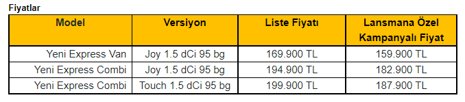 Renault markasının üstün özelliklerinden yararlanarak, tüm bireysel ve ticari ihtiyaçlara cevap veren Yeni Express Combi ve Express Van 27 Eylül’den itibaren Türkiye’de satışa sunuluyor.