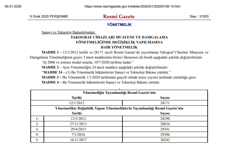 2012 yılında takograf uygulamalarının amacına hizmet etmesi için çeşitli düzenlemeler yapılmıştı. Bu düzenlemeler kapsamında dijital takografa geçişle ilgili araç model yıllarına bağlı 5 yıllık bir takvim belirlenmiş ve 2014 yılında süreç kademeli olarak başlatılmıştı. Dijital takografa geçiş için değişim sürecine mevzuatta tanınan süre 31/12/2019 tarihinde son bulmuş ve zorunluluk başlamıştı. Sanayi ve Teknoloji Bakanlığı ise yeni bir adım atarak bu süreyi 10/07/2020 tarihine kadar uzattı.