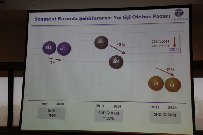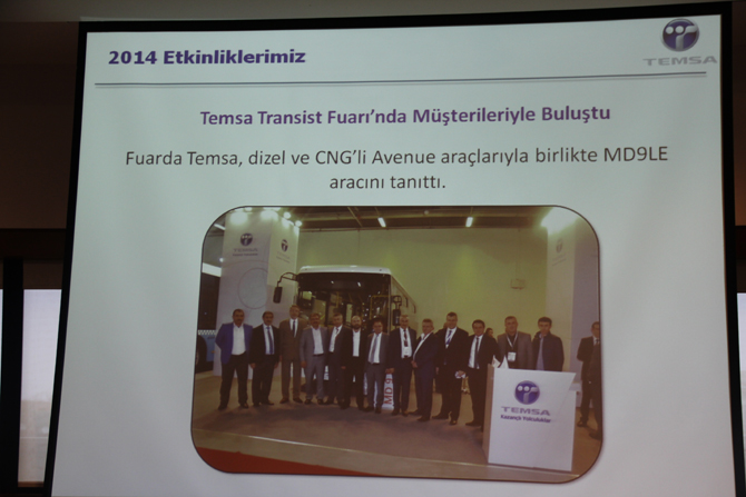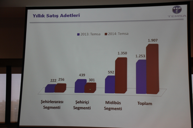 Basın toplantısına 2014 yılına yönelik otobüs pazarı verilerine yönelik açıklamalarla başlayan Temsa Genel Müdürü Dinçer Çelik, “2014 yılında toplam otobüs pazarı 2013’e göre yüzde 19 civarında daralarak 6 bin 348 adetlik bir satışla tamamlandı. Toplam otobüs pazarında Temsa olarak, 2013'te 1253 adet satış gerçekleştirirken yüzde 19 daralan pazarda satış adetlerimizi 654 adet artırmayı başardık ve 2014’te 1907 adetlik bir satış ile yüzde 30’luk bir pazar seviyesine ulaştık” dedi.