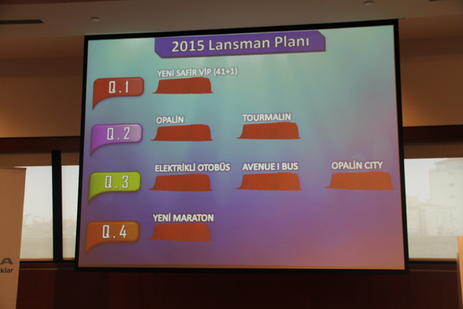 2014 yılında Türkiye pazarına yönelik Safir, 12 ve 18 metrelik Avenue dizel, CNG’li Avenue, Prestij Super Deluxe, Prestij City ve MD9’un üretiminin devam ettiğini belirten Dinçer Çelik, 2015’te 9 yeni ürün lansmanı yapacaklarını vurguladı. Yeni ürünlerle Türkiye pazarında sahip oldukları güçlü seviyeyi daha da yukarıya taşıyacaklarını açıklayan Dinçer Çelik, “Yeni ürünlerin, pazar payımızı daha da artıracağına inanıyoruz. Yeni ürünlerin lansmanlarında çok kısa süre içerisinde yeniden bir araya geleceğiz” dedi.