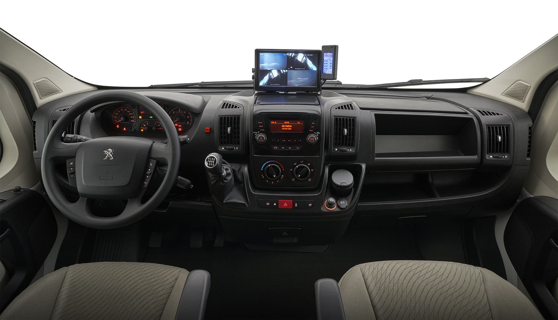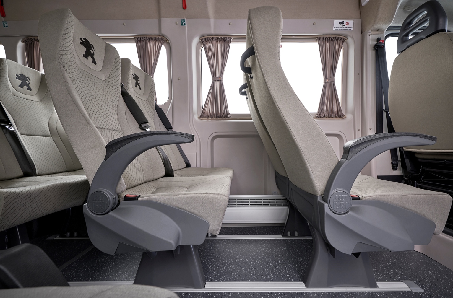 Çift renk LED iç aydınlatma, mavi ve beyaz iki renkli LED aydınlatma hem iç mekanda keyifli bir ambiyans sağlıyor hem de LED teknolojisi sayesinde aküden daha az enerji çekerek enerji verimliliğine katkı sağlıyor. Her yolcu için ayrı klima havalandırma ızgaraları sayesinde yolcular hava akımının debisini ve yönünü kendi isteklerine göre ayarlayabiliyor böylece daha konforlu ve daha sağlıklı bir seyahat deneyimi yaşayabiliyor. Radyo, USB & Bluetooth bağlantı çözümleriyle sürücüye zengin bağlanabilirlik çözümleri sunuyor. Koltuk sensörleri, güvenlik kameraları ve takip ekranları okul servisi versiyonunda sunulan iç ve dış kamera takibi sayesinde çocukların güvenliği en üst seviyeye çıkıyor. Ayrıca her yolcu koltuğunun yönetmeliğe uygun sensörler vasıtasıyla ayrı ayrı kontrol edildiği ekran ve sesli uyarılar sayesinde servis aracında çocuk unutulma ihtimali tamamen ortadan kalkıyor. Webasto klima ve ısıtma sistemi ile araç içerisinde konfor en üst noktaya ulaşıyor. Otomatik yan kapı kontrol butonu aracın yolcu giriş çıkışlarını güvenle ve zahmetsiz bir şekilde gerçekleştirmeyi sağlıyor. Direksiyon üzerindeki radyo ve telefon kontrol butonları sayesinde sürücü yolunu gözden ayırmadan radyo ve telefon fonksiyonlarına gerekli komutları kolayca verebiliyor. Dış ortam sıcaklığı bilgisini veren Dot Matrix saat sayesinde zamanı ve dış ortam sıcaklığını takip etmek kolaylaşıyor. Geniş diz mesafesi (28 cm) ve yolcu bölümü koridor mesafesi (36 cm) daha konforlu bir yolculuk sunarken araç iniş binişleri kolaylaşıyor. Dayanıklı cam perdeleri ve yüksek kalitedeki montaj bağlantıları kabin içi kalite algısını ve dayanıklılığını artırıyor. Özellikle uzun vadedeki kullanımlarda aracı rakiplerinden ayrıştıracak en önemli özelliklerden biri “Peugeot Kalitesi”.