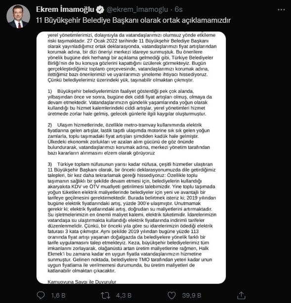 İstanbul Büyükşehir Belediye Başkanı Ekrem İmamoğlu'nun 11 büyükşehir belediye başkanı adına Twitter hesabı üzerinden paylaştığı açıklama şöyle: