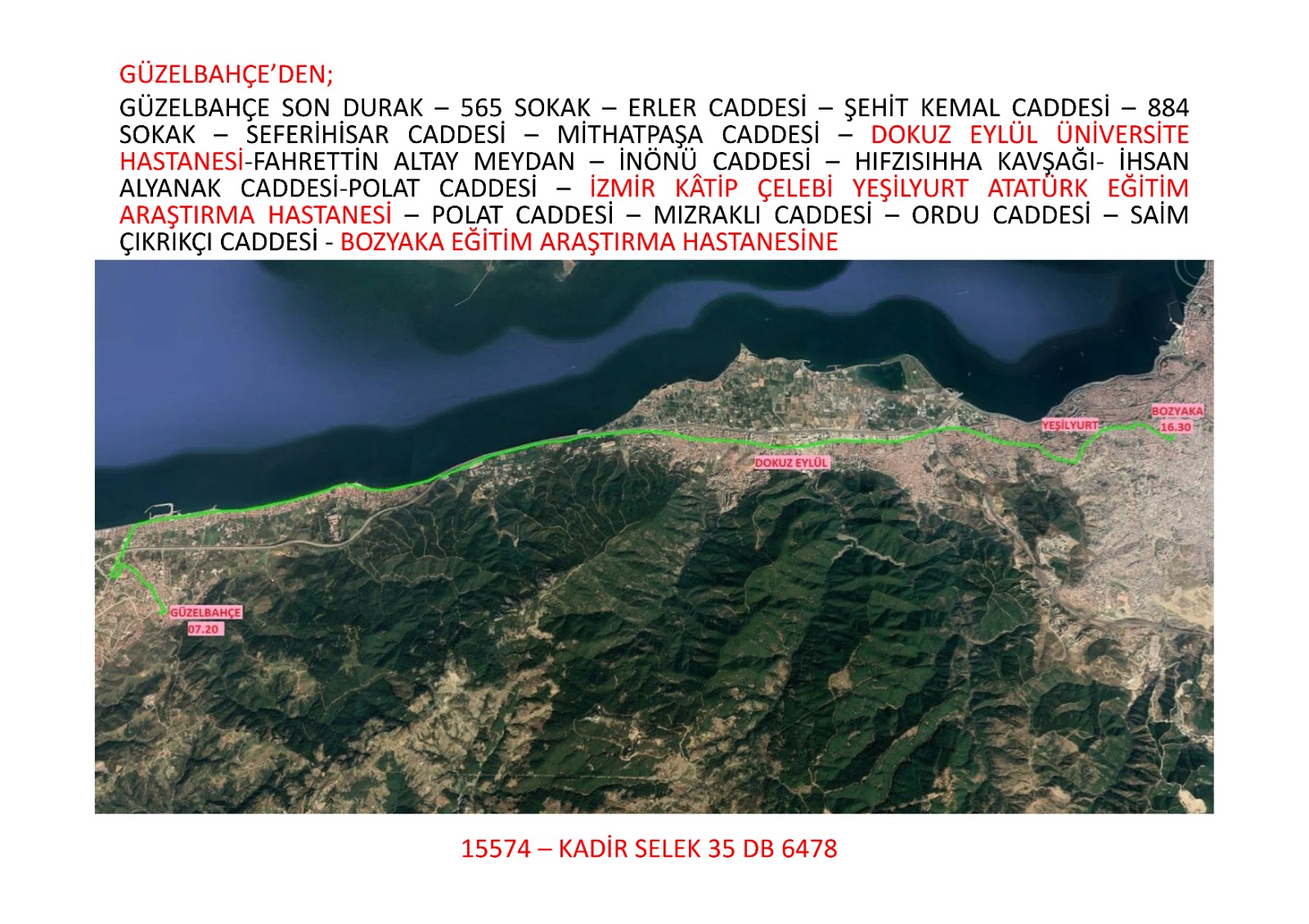 Güzelbahçe otobüs son durağından hareket edecek servis otobüsü; 565 Sokak, Erler Caddesi, Şehit Kemal Caddesi, 884 Sokak, Seferihisar Caddesi, Mithatpaşa Caddesi, DEÜ Hastanesi, F.Altay Meydanı, İnönü Caddesi, Hıfzıssıhha Kavşağı, İhsan Alyanak Caddesi, Polat Caddesi, İKÇÜ Yeşilyurt Atatürk Eğitim ve Araştırma Hastanesi, Mızraklı Caddesi, Ordu Caddesi, Saim Çıkrıkçı Caddesi, Bozyaka Eğitim ve Araştırma Hastanesi güzergâhını takip edecek.