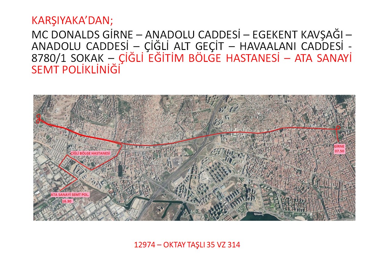 Karşıyaka Girne Caddesi'ndeki McDonalds'ın önünden kalkacak servis otobüsü; Girne Bulvarı, Anadolu Caddesi, Egekent Kavşağı, Anadolu Caddesi, Çiğli Altgeçit, Havaalanı Caddesi, 8780/1 Sokak, Çiğli Eğitim Bölge Hastanesi, Ata Sanayi Semt Polikliniği güzergâhını takip edecek.