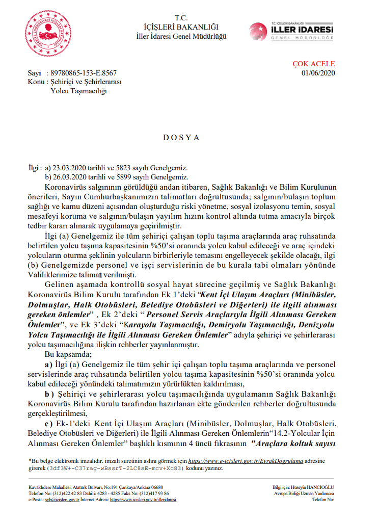 İlgi (a) Genelgemiz ile tüm şehiriçi çalışan toplu taşıma araçlarında araç ruhsatında belirtilen yolcu taşıma kapasitesinin %50’si oranında yolcu kabul edileceği ve araç içindeki yolcuların oturma şeklinin yolcuların birbirleriyle temasını engelleyecek şekilde olacağı, ilgi (b) Genelgemizde personel ve işçi servislerinin de bu kurala tabi olmaları yönünde Valiliklerimize talimat verilmişti.