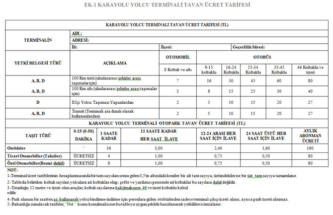 Terminali kullanan belge sahibi taşımacıların sahip olduğu her taşıt başına sadece terminal çıkışlarında, taşıt başına; günlük, haftalık veya aylık olarak terminal alanı içerisinde bulunan otoparklarını kullanan araç sahiplerinden ve müşterilerine ücretsiz şehir içi ulaşımı sağlayan taşıtlarından alınan ücretlerin tavan fiyatları açıklandı.