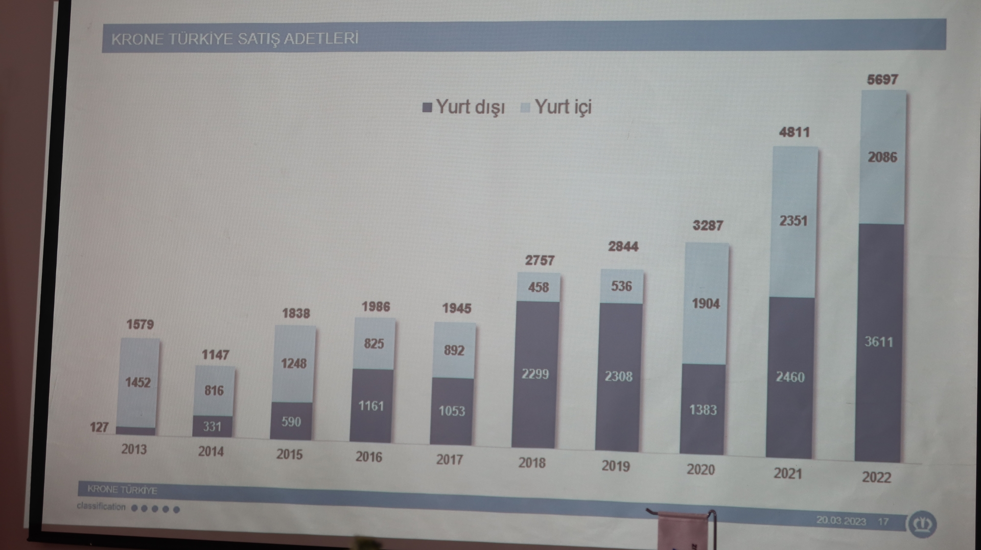 Semih Pala yaptığı açıklamada “KRONE Türkiye 2022 yılı iç pazar ve ihracat toplam satış adeti, 2021 yılına göre %18 artışla 5.697 adet olarak gerçekleşti. 2022 yılı TAİD ve TREDER verilerine göre Türkiye’de toplam 24.000 adet treyler (tenteli, frigorifik, konteyner taşıyıcı, platform) satışı oldu. KRONE kalitesi Türkiye’nin yanı sıra; Avrupa, Afrika, Ortadoğu, Uzakdoğu ve Güney Amerika’dan 31 ülke ile buluşuyor. İhracatımız 2021 yılına göre %47 arttı. Türkiye iç pazarında ise 2022 yılında 2.086 adet treyler satışı gerçekleştirdik.” dedi.