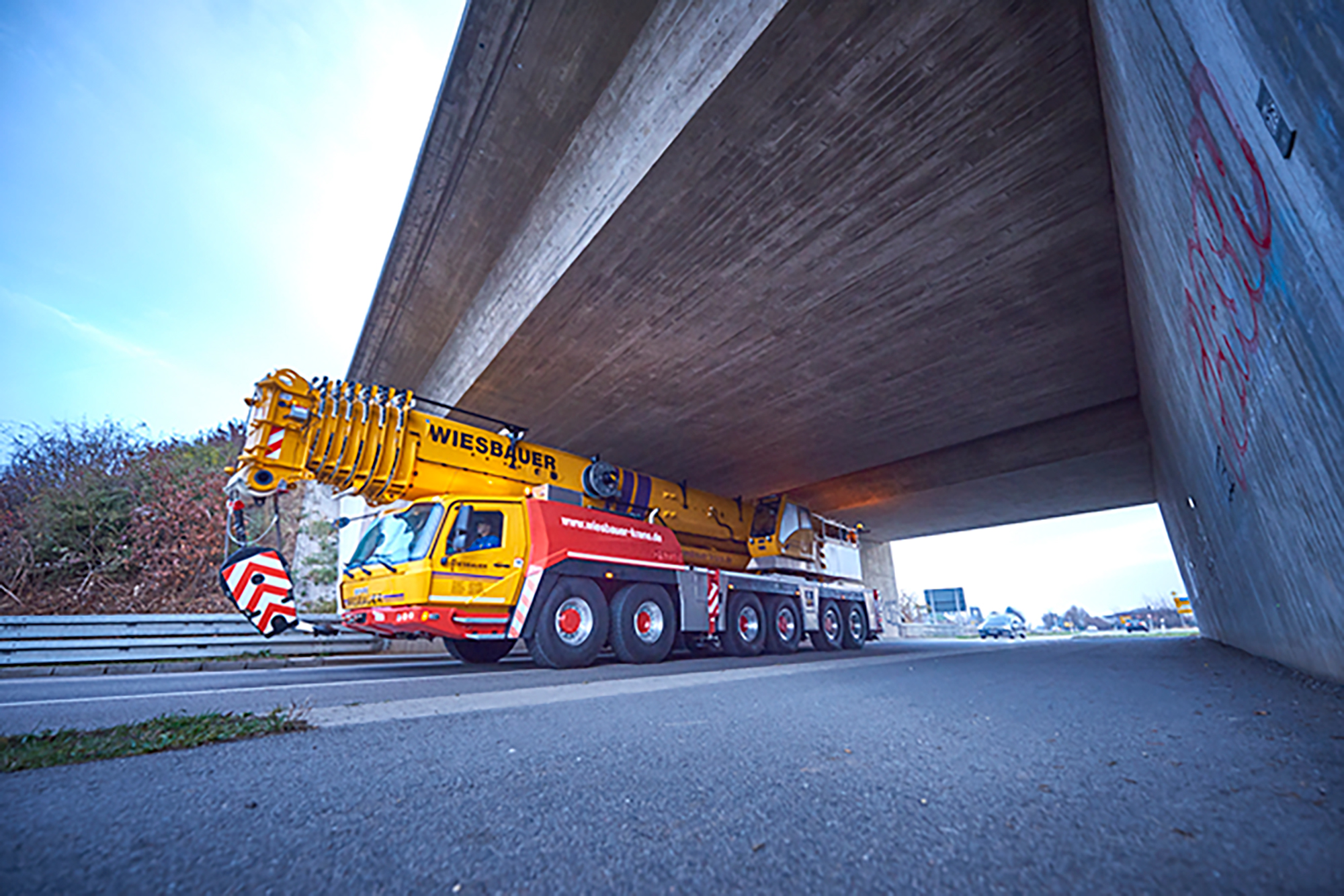 Kamuya açık yollarda, vinçler trafiğe engel olmamalıdır. Yeşil trafik ışığı, vinçler için bile zamanında ivmelenmeyi gerektirir. Bu altı akslı vinç, karayollarından çalışma sahasına giderken 85 km / s hız yapabiliyor.