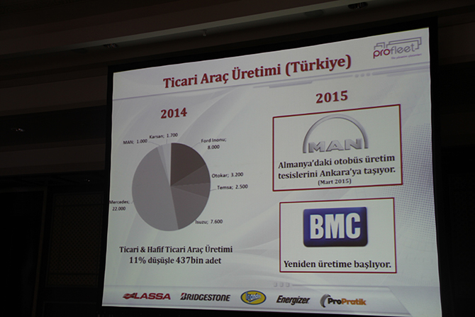 Türkiye’deki ticari ve hafif ticari araç üretimi 2014 yılında %11 düşüşle 437.000 adet olarak gerçekleşti. 2015 yılında açılacak yeni üretim tesislerinin sektöre olumlu katkı yapması bekleniyor.Türkiye ticari araç parkı Avrupa’nın birçok ülkesinden fazla olmasına rağmen en yaşlı araç parklarından biri olduğu belirtildi.