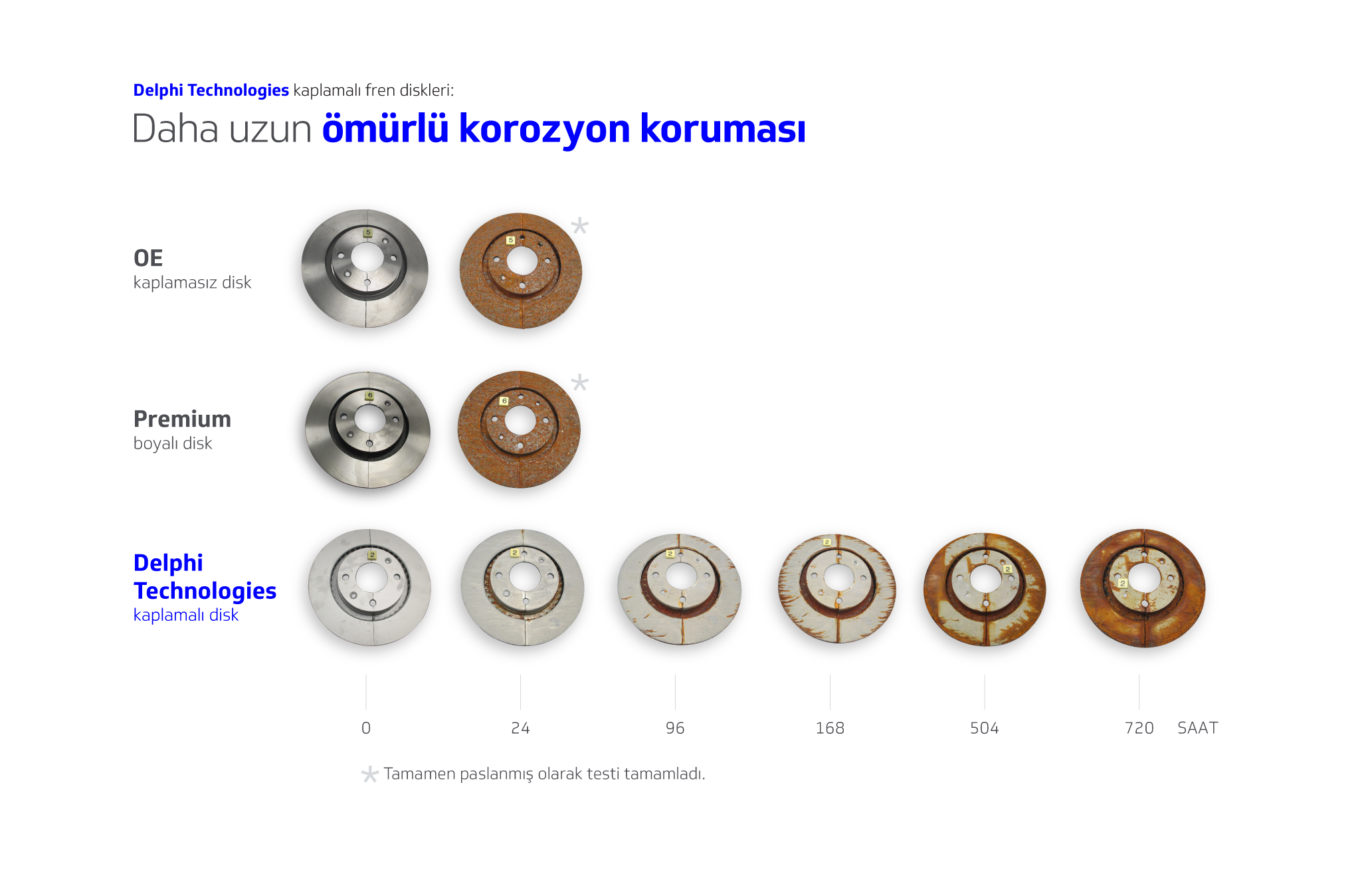 Konuyla ilgili konuşan Delphi Technologies Aftermarket Küresel Pazarlama Ürün ve Strateji Başkan Yardımcısı Neil Fryer, dökme demir fren disklerinin yollardaki tuz, çamur ve sudan kaynaklanan korozyona dirençli olmadığını vurgulayarak, “Boyalı veya kısmi kaplamalı diskler, monte edildiği zaman daha iyi görünürler. Özellikle kış aylarında kirletici maddeler, korunmasız yüzeylere hızlı ve kolay şekilde nüfuz ederek korozyon ile hızlı aşınma ve yıpranmaya yol açabilir. Biz de ilgili testlerin de gösterdiği şekilde; üst başlık, dış kenar, dâhili oluklar ve sürtünme yüzeyleri dâhil olmak üzere disklerimizin tüm yüzeylerine çevre dostu, su ve çinko pul bazlı Geomet kaplama uygulayarak korumayı önemli ölçüde artırdık. Bu testler, fren diskleri söz konusu olduğunda, yüzeyin görünen kısmıyla birlikte kalite ve dayanıklılık açısından görünmeyen kısmının da ne kadar önemli olduğunu kanıtlıyor” dedi.