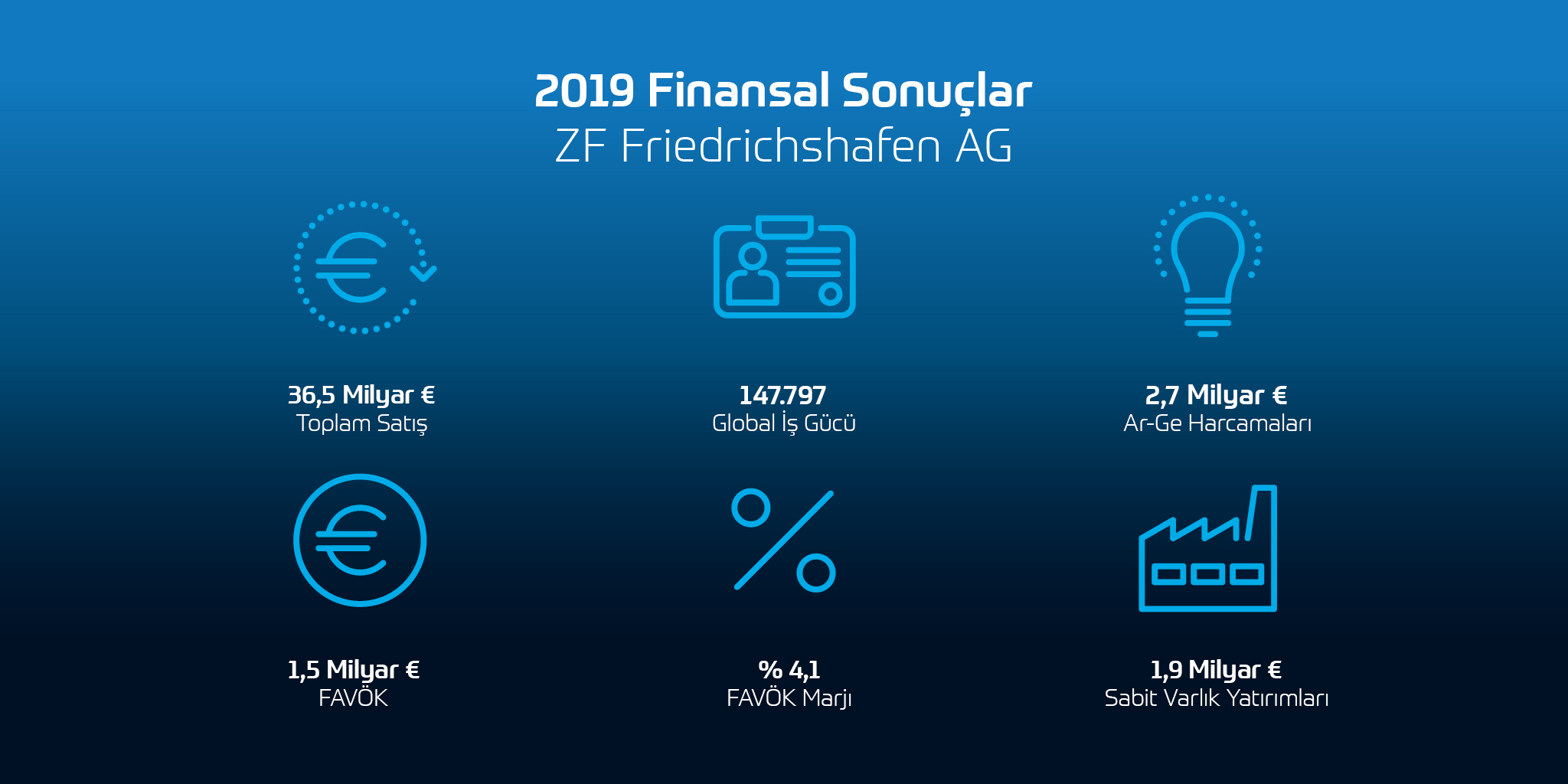 ZF'nin konsolide Grup satışları | 36,5 milyar € (milyar) | 36,9 milyar € |