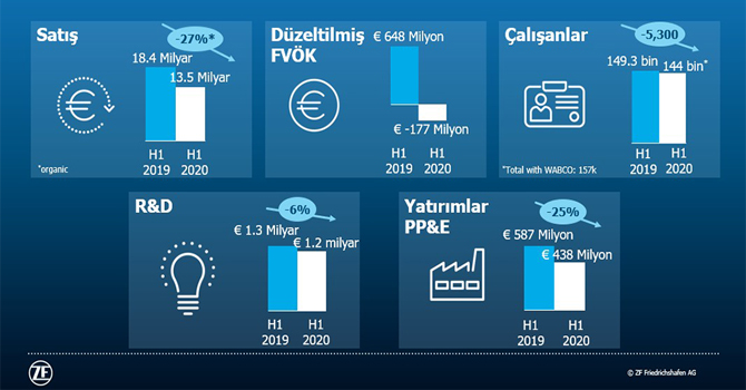 Otomotiv endüstrisinde pandeminin neden olduğu talep düşüşü ve üretimin geçici olarak durması nedeniyle, ZF’nin 2020'nin ilk yarısına ilişkin rakamları, geçen yılın aynı dönemine ait rakamların önemli ölçüde altında kaldı. Satışlar 13,5 (2019: 18,4) milyar Euro olarak gerçekleşti. Bu rakamlara döviz kuru, birleşme ve satın alma etkileri yansıtıldığında eksi yüzde 27'lik bir organik satış değişikliğine karşılık geliyor. Şirket, eksi 177 milyon € tutarında düzeltilmiş bir FAVÖK bildirdi. Bu, eksi yüzde 1,3'lük düzeltilmiş FAVÖK marjına karşılık geliyor. 2019'un ilk yarısında ZF, 650 milyon Euro civarında düzeltilmiş bir FAVÖK bildirdi; bu yüzde 3,5'lik düzeltilmiş FAVÖK marjına karşılık geliyor. 2020'nin ilk yarısı için net sonuç eksi 911 milyon Euro şeklinde gerçekleşti.