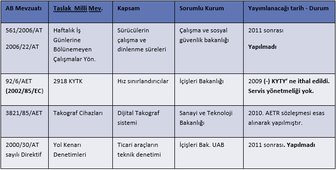 AETR Sözleşmesi gereği ve AB Mevzuatına uyum kapsamında yapılması gereken mevzuat çalışmaları ile ilgili olarak 2008 yılında bir Bakanlar Kurulu Kararı yayınlanmıştır. Buna göre takografı ilgilendiren mevzuat ve sorumlu makamlar aşağıdaki tabloda görülmektedir.