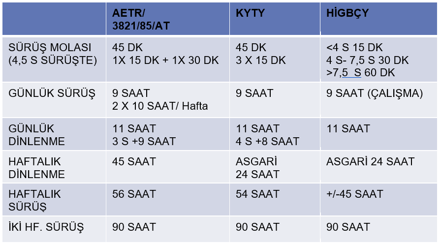 Karayolları Trafik Yönetmeliği Md. 98 de, sürücülerin çalışma ve sürüş süreleri yer almaktadır. Burada belirtilen kurallar hem AETR sözleşmesinden ve hem de Haftalık İş Günlerine Bölünemeyen Çalışma Süreleri Hakkında Yönetmelik’ ten farklıdır.