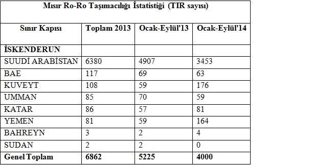 Öte yandan, RO-RO hattındaki teşvik uygulamasının kalkması ile birlikte bu hattın kullanımı da giderek düştü.. 2013 yılında RO-RO ile Mısır ve Ortadoğu ülkelerine yapılan ihracat taşımaları 6862 iken, bu rakam 2014 yılında 4.000’e geriledi.